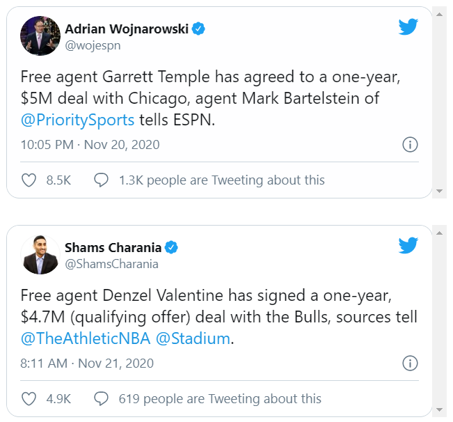 The Bulls have reportedly offered one-year deals to both Garrett Temple and Denzel Valentine according to Adrian Wojnarowski and Shams Charania for $5 million and $4.7 million, respectively.
